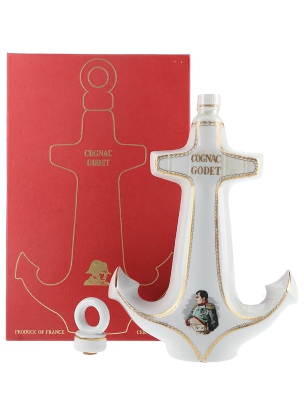 A bottle of Godet Cognac presented in an anchor-shaped ceramic decanter.