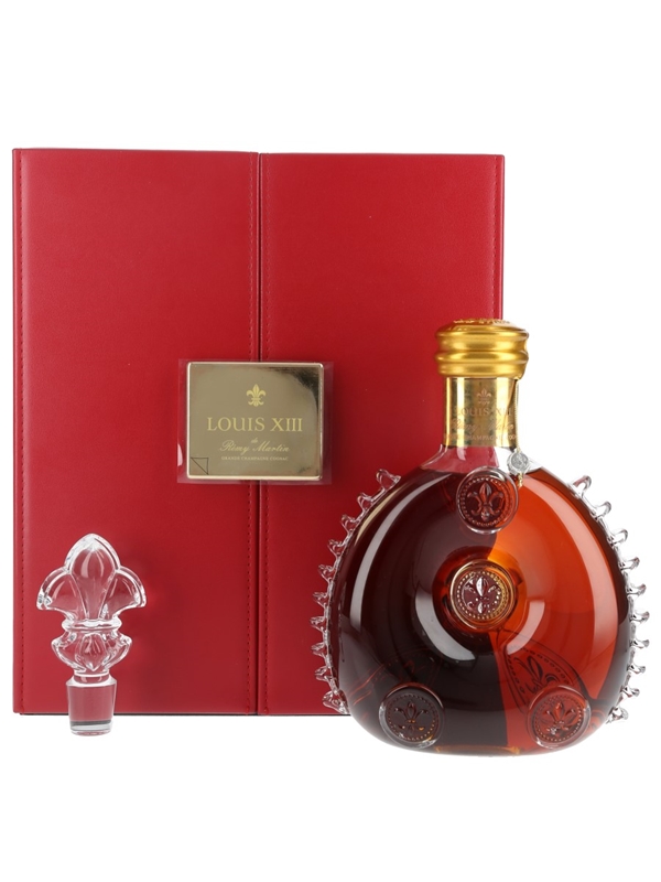 A bottle of Louis XIII de Rémy Martin Cognac. This is composed of Grande Champagne eaux-de-vie aged between 40 and 100 years and is presented in a Baccarat crystal decanter. The bottling code indicates this was bottled in 2017.