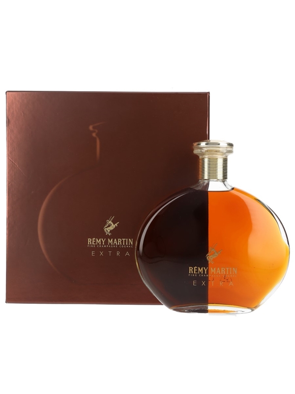 A bottle of Rémy Martin Extra Fine Champagne Cognac. This is produced from grapes grown in Cognac's top two regions, the Grande Champagne and Petite Champagne districts, and is a blend of brandies aged for between 20 and 50 years in cask before bottling and blending.