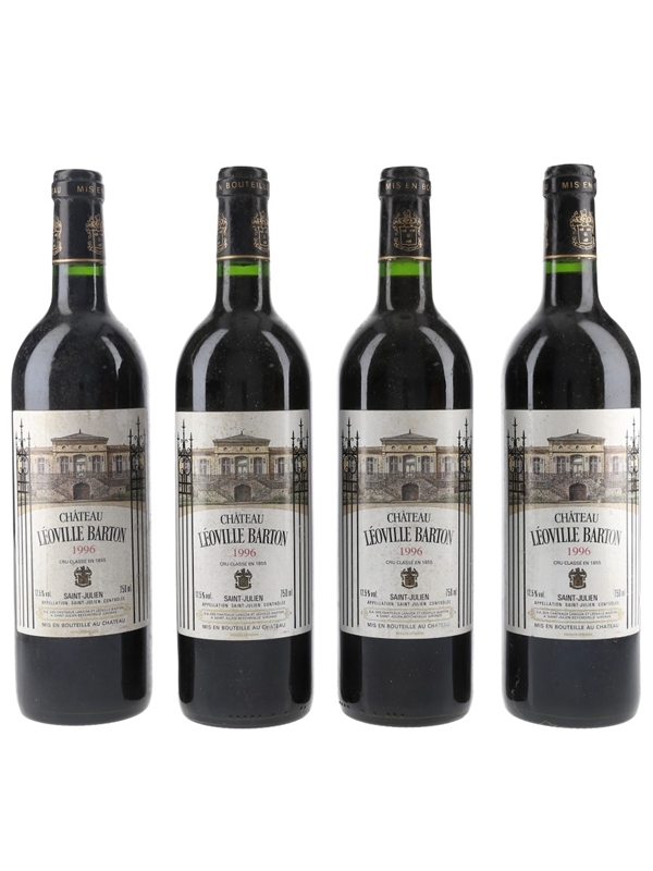 This lot contains four bottles of 1996 Château Léoville Barton from Bordeaux's Saint-Julien appellation.