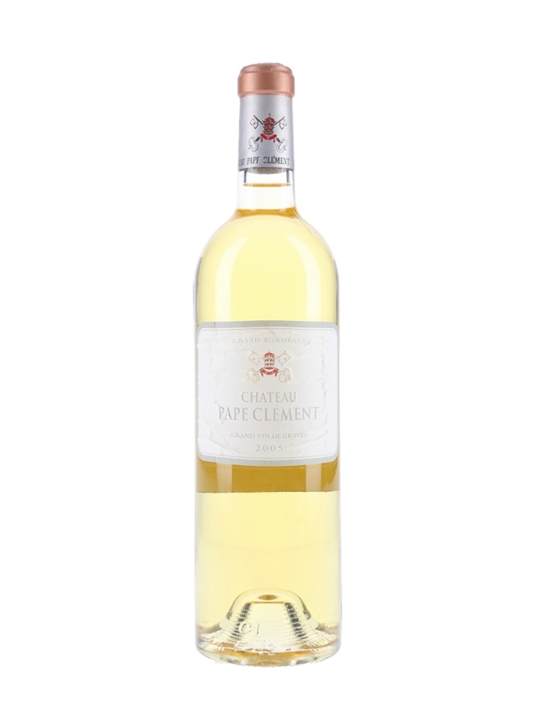 A bottle of 2005 Château Pape Clément white wine from Bordeaux's Graves appellation. This is a blend of 50% Sémillon, 40% Sauvignon Blanc and 10% Muscadelle.