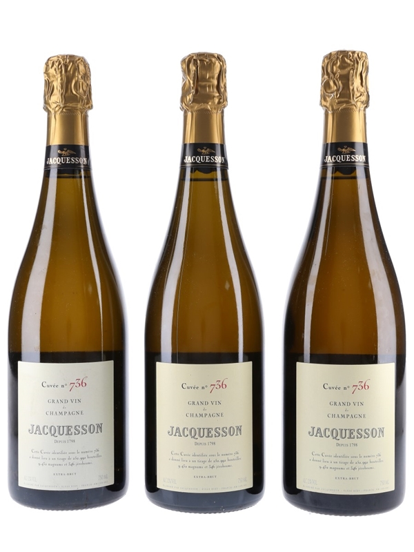 This lot contains three bottles of Jacquesson Cuvée 736, 66% of which is from the highly regarded 2008 vintage, with the balance made up of reserve wines. The blend is 53% Chardonnay, 29% Pinot Noir and 18% Pinot Meunier, and was fermented in oak casks prior to bottle fermentation. It was disgorged in October 2012.