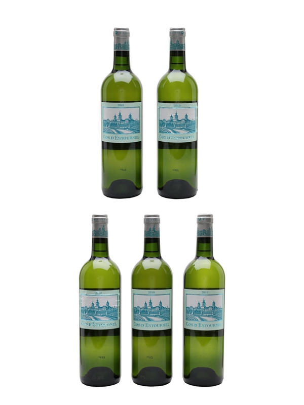This lot contains five bottles of 2010 white Bordeaux from St.Estéphe 'Super Second' Château Cos D'Estournel. Approximately 7,000 bottles are produced of this blend of 70% Sauvignon Blanc and 30% Sémillon.