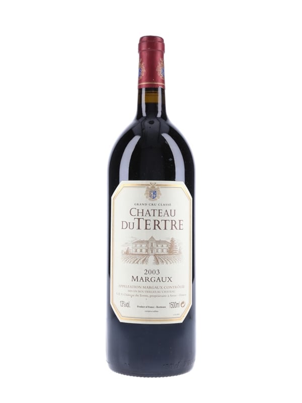 A magnum bottle of 2003 Château du Tertre from Bordeaux's Margaux appellation. Du Tertre is a 52 hectare estate planted with 43% Cabernet Sauvignon, 33% Merlot, 19% Cabernet Franc and 5% Petit Verdot, with some plots dating back to the early 1960s.