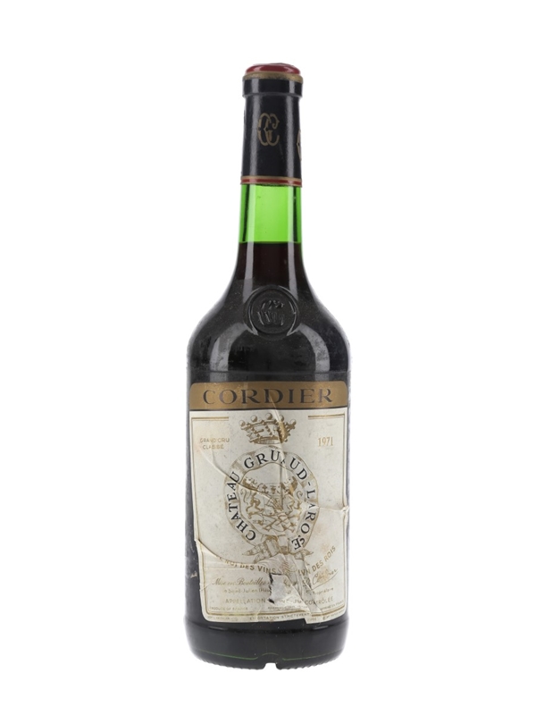 A bottle of 1971 Château Gruaud-Larose from Bordeaux's Saint-Julien appellation. The property was ranked as a Deuxième Cru Classé in the 1855 Classification, and its 82 hectares are planted with 57% Cabernet Sauvignon, 31% Merlot, 7.5% Cabernet Franc, 3% Petit Verdot and 1.5% Malbec. Known for its substantial structure and fruit-driven style, it's motto is 'le vin des rois, le roi des vins' : 'the wine of kings, the king of wines.'