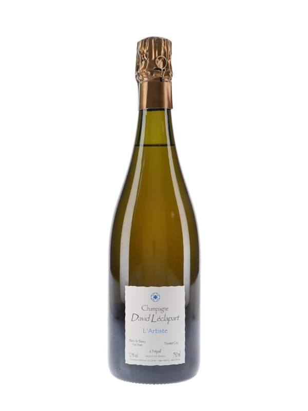 A bottle of David Leclapart L'Artiste Blanc de Blancs Champagne produced biodynamically using fruit from Chardonnay vines of 30 to 50 years or age from the village of Trépail.