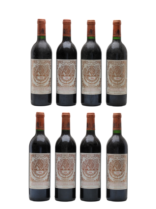 This lot contains eight bottles of 1988 Château Pichon-Longueville Baron from Bordeaux's Pauillac appellation. 'Pichon Baron' is a 'Super Second' growth Château, with vineyards currently planted with 60% Cabernet Sauvignon, 35% Merlot, 4% Cabernet Franc and 1% Petit Verdot.
