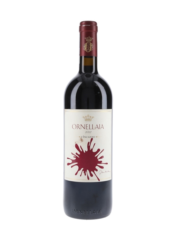 A bottle of Ornellaia 2012 Bolghieri L'Incanto Wine produced in Italy, a blend of 56% Cabernet Sauvignon, 27% Merlot, 10% Cabernet Franc and 7% Petit Verdot.