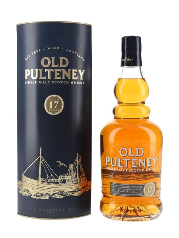 A bottle of Old Pulteney 17 Year Old Single Malt Scotch Whisky, matured in bourbon and sherry casks.