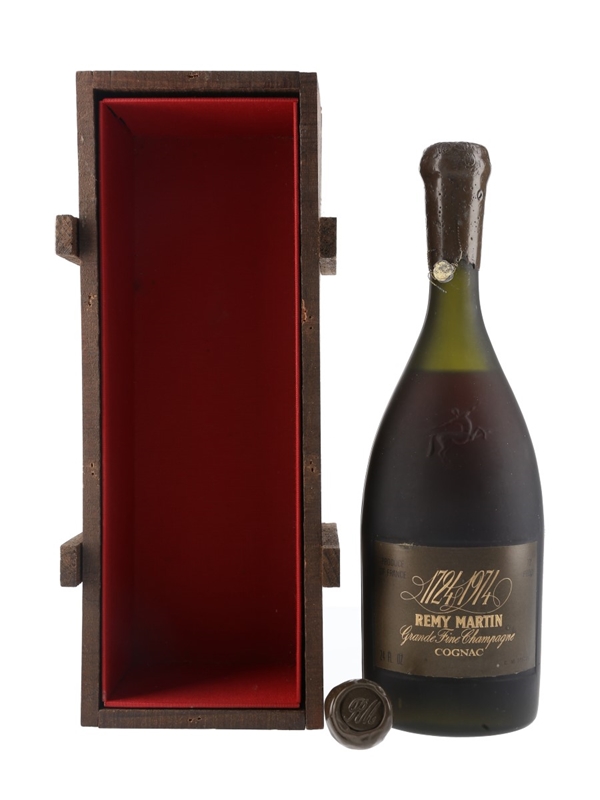 A 68cl bottle of Rémy Martin Grande Fine Champagne Cognac, bottled for the company's 250th anniversary. This was produced from grapes grown in the Premier Cru of Cognac and was bottled in 1974. The bottle is presented in a wooden box with a certificate of authenticity and a stopper.