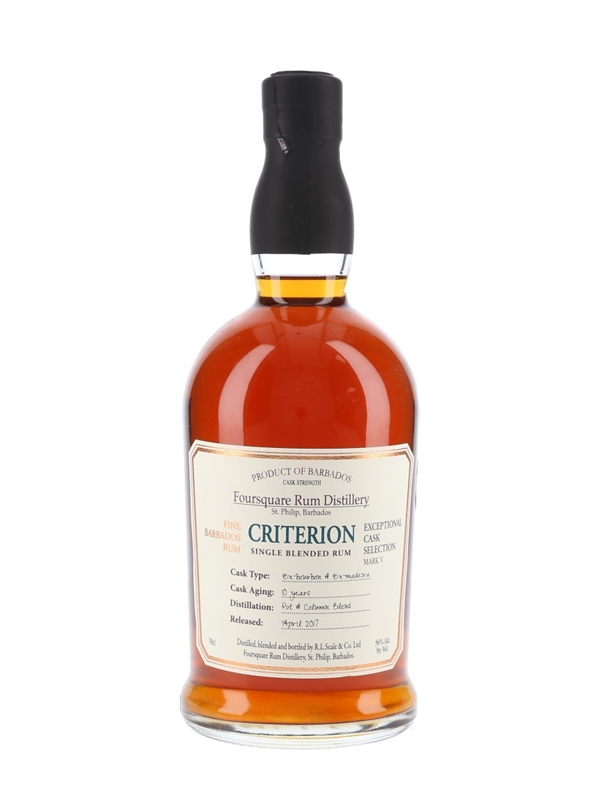 A bottle of Foursquare Criterion 10 Year Old Single Blended Rum from Barbados. This is a blend of pot still and twin column continuous distillate, matured in ex-Madeira casks for 10 years and released in April 2017 as part of the Exceptional Cask Selection series.
