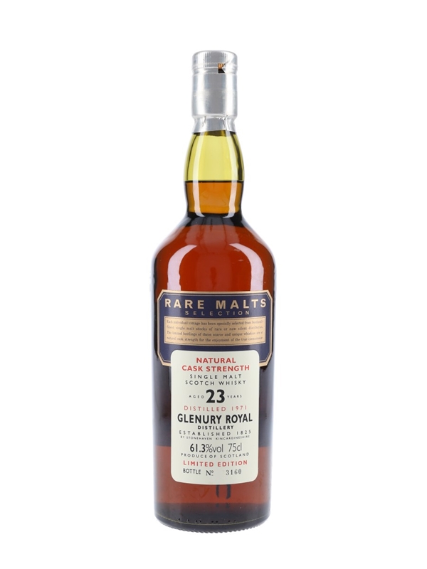 A bottle of Glenury Royal 23 Year Old Single Malt Scotch Whisky. This was distilled in 1971 and bottled for Diageo's now-discontinued Rare Malts Selection.