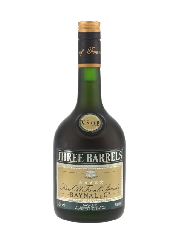 A 68cl bottle of Three Barrels VSOP 5 Star Rare Old French Brandy, produced by Raynal & Co. We estimate this was bottled in the 1980s.