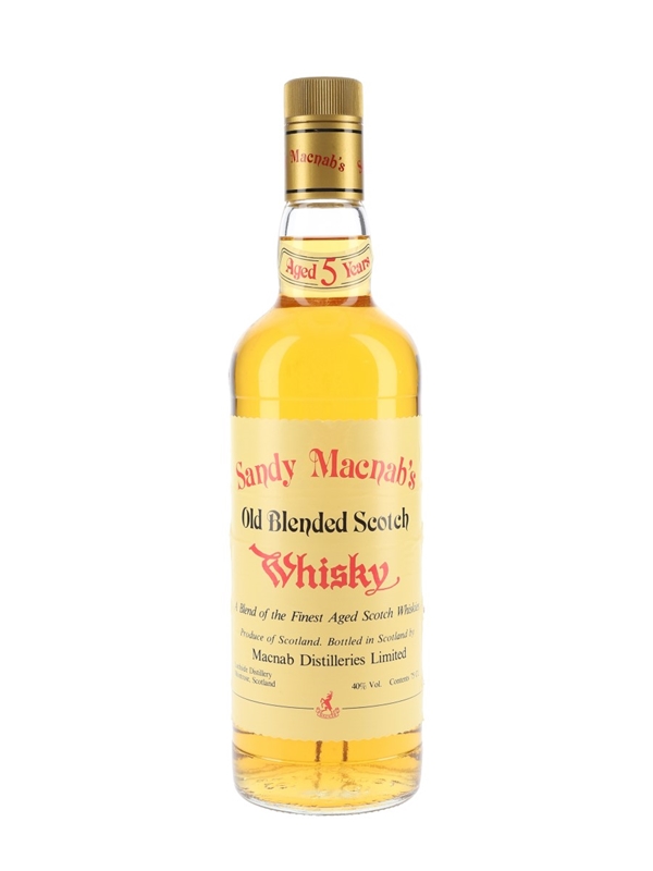 A bottle of Sandy Macnab's 5 Year Old a Blend of Finest Aged Scotch Whisky from Macnab Distillers Limited, Lochside Distillery, Montrose, Scotland. We estimate this was bottled in the 1980s.