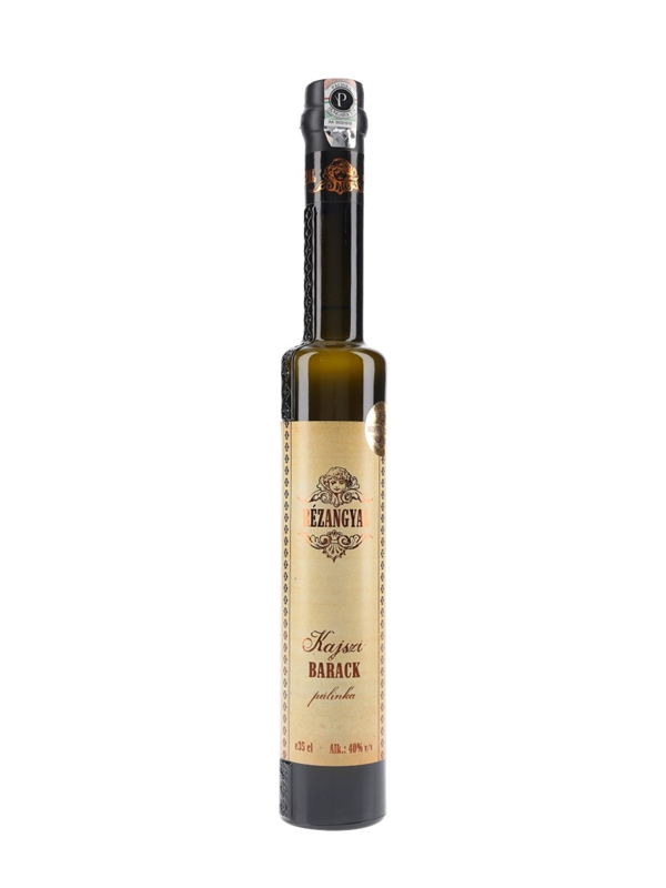 A bottle of Rézangyal Kajszi Barack Palinka, an apricot brandy produced in Hungary in a traditional long-necked bottle.