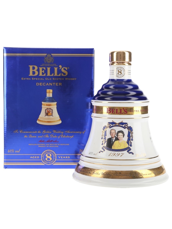 A bottle of Bell's 8 Year Old Extra Special Old Scotch Whisky presented in a genuine wade porcelain decanter and released in 1997 to celebrate the Golden Wedding Anniversary of Queen Elizabeth II and the Duke of Edinburgh.