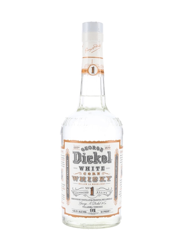 A bottle of George Dickel No.1 White Corn whisky, an unaged spirit based on the distillery's Foundation Recipe. This was distilled and charcoal mellowed at George A Dickel & Co. Tullahoma, Tennessee.