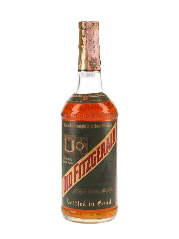 A bottle of Old Fitzgerald 6 Year Old Kentucky Straight Bourbon Whiskey, distilled at the Stitzel-Weller distillery, Louisville. This was imported to Italy by D & C. The bottling code indicates the glass was made in 1973.