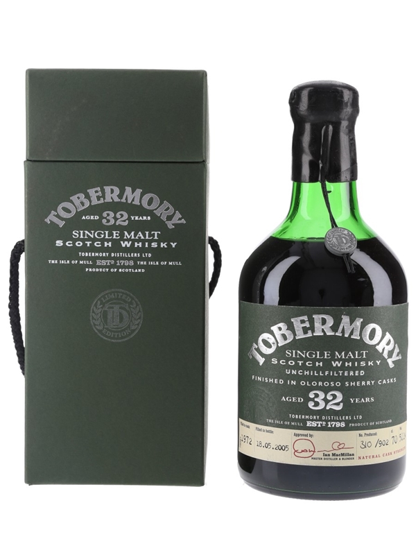 A bottle of Tobermory 32 Year Old Single Malt Scotch Whisky from the Isle of Mull. This was distilled in 1972, finished in oloroso sherry casks and bottled at cask strength in 2005.
