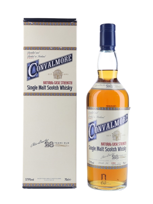 A bottle of Convalmore 28 Year Old Single Malt Scotch Whisky. This was distilled in 1977 and bottled at cask strength of 57.9% ABV in 2005 as part of Diageo's annual Special Releases series.