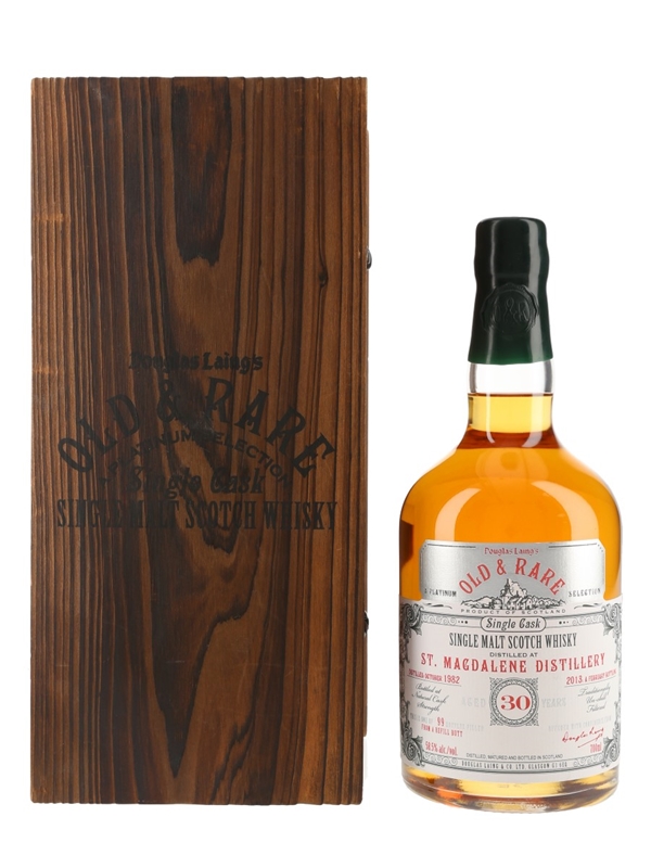 A limited edition bottle of St Magdalene 30 Year Old Single Malt Scotch Whisky. This was distilled in October 1982, matured in a single refill butt and bottled in February 2013 by Douglas Laing & Co. Ltd. as part of the Old & Rare Platinum Selection series.
