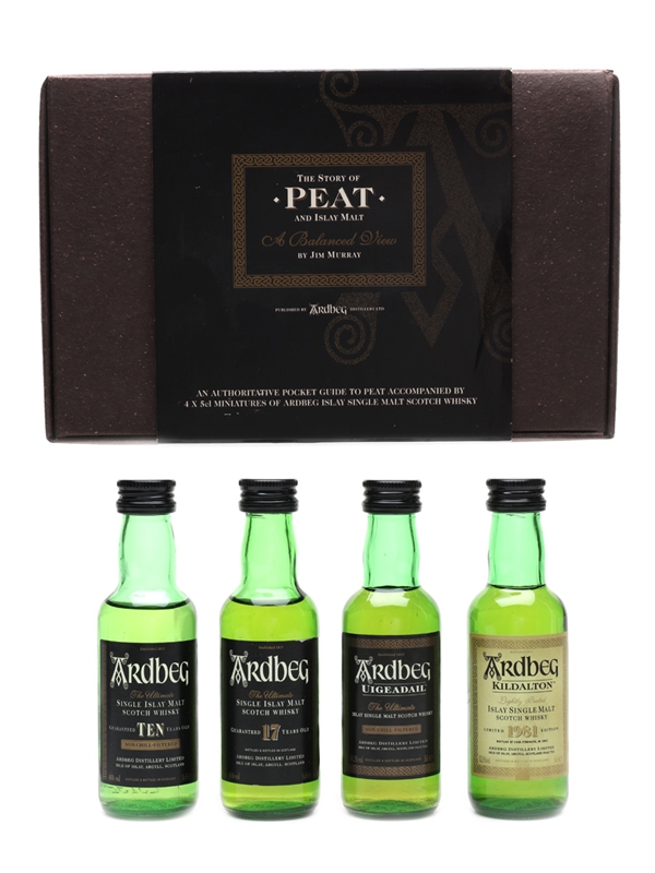 The Story of Peat and Islay Malt set contains four miniature bottles of Single Islay Malt Scotch whsiky including Ardbeg 10 Year Old, 17 Year Old, Uigeadail and Kildalton 1981.