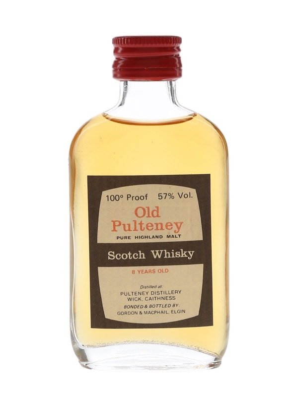 A miniature bottle of Old Pulteney 8 Year Old 100 Proof Pure Highland Malt Scotch Whisky. This was bonded and bottled by Gordon & MacPhail, we estimate in the 1970s to 1980s.