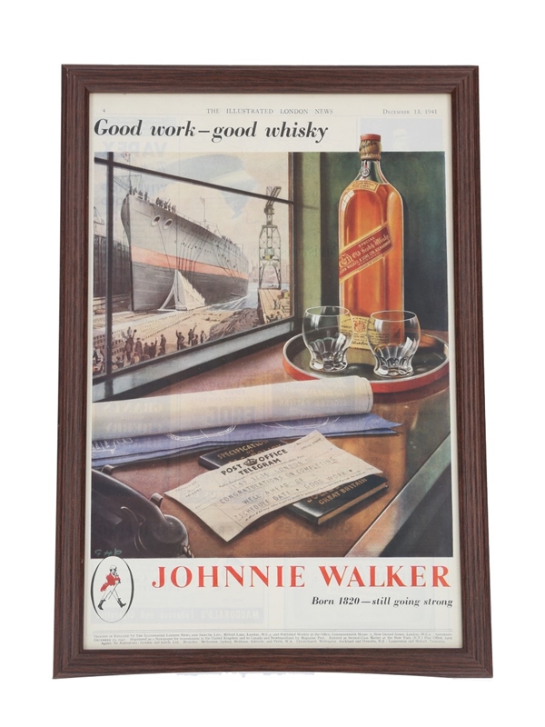 A framed Johnnie Walker advertisement - Good Work, Good Whisky. This is taken from the 13 December 1941 edition of The Illustrated London News.