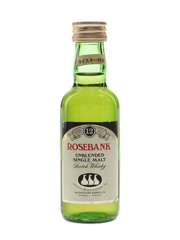 A miniature bottle of Rosebank 12 Year Old Unblended Single Malt Scotch Whisky. This was specially bottled for The Distillers Agency Ltd. and imported to Japanese market, we estimate in the 1980s.
