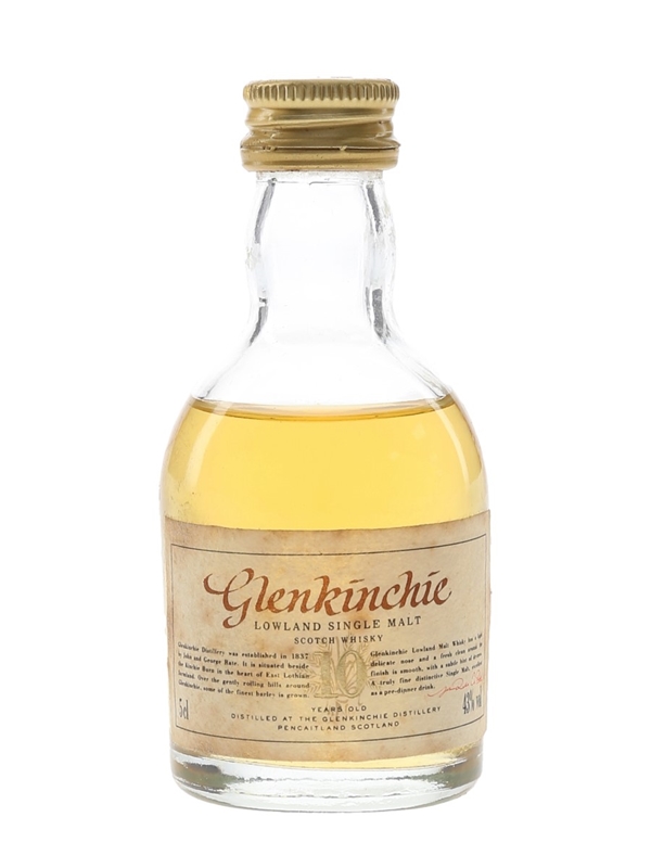 A miniature bottle of Glenkinchie 10 Year Old Lowland Single Malt Scotch Whisky. This expression was the Lowland representative in Diageo's Classic Malts range, until it was discontinued and replaced by the 12 year old. We estimate this was bottled in the 1990s.