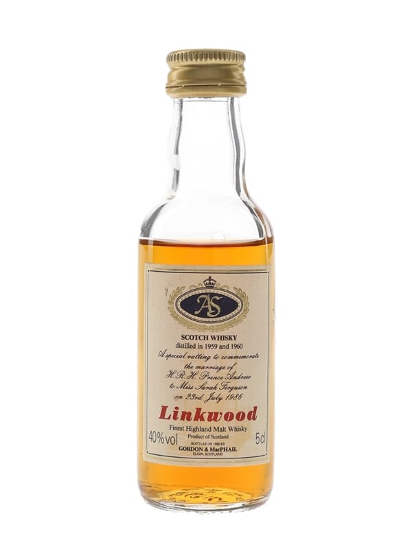 A miniature bottle of Linkwood Finest Highland Malt Whisky, bottled by Gordon & MacPhail. This is a vatting of two vintages distilled in 1959 and 1960, bottled to commemorate the marriage of Prince Andrew and Sarah Ferguson on 23 July 1986.