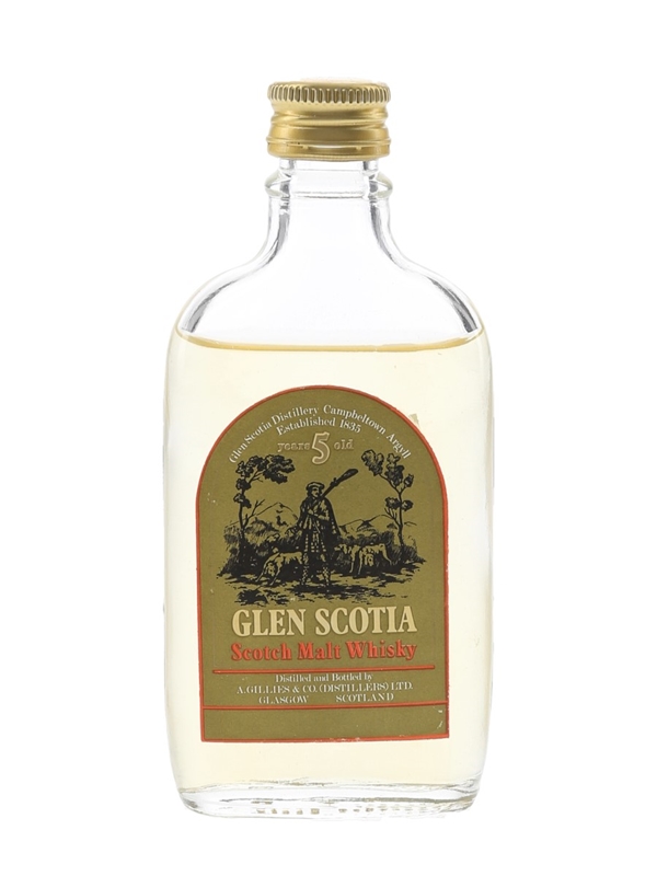 A miniature bottle of Glen Scotia 5 Year Old Scotch Malt Whisky, distilled and bottled by A Gillies & Co. (Distillers) Ltd. We estimate this was bottled in the 1960s to 1970s.