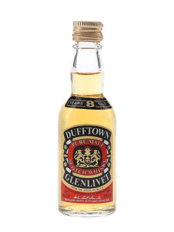 A miniature bottle of The Dufftown Glenlivet 8 Year Old Pure Malt Scotch Whisky from The House Of Bell's, distilled and bottled by Arthur Bell & Sons. We estimate this was bottled in the 1970s, when it was common to use the 'Glenlivet' suffix for Speyside distilleries.