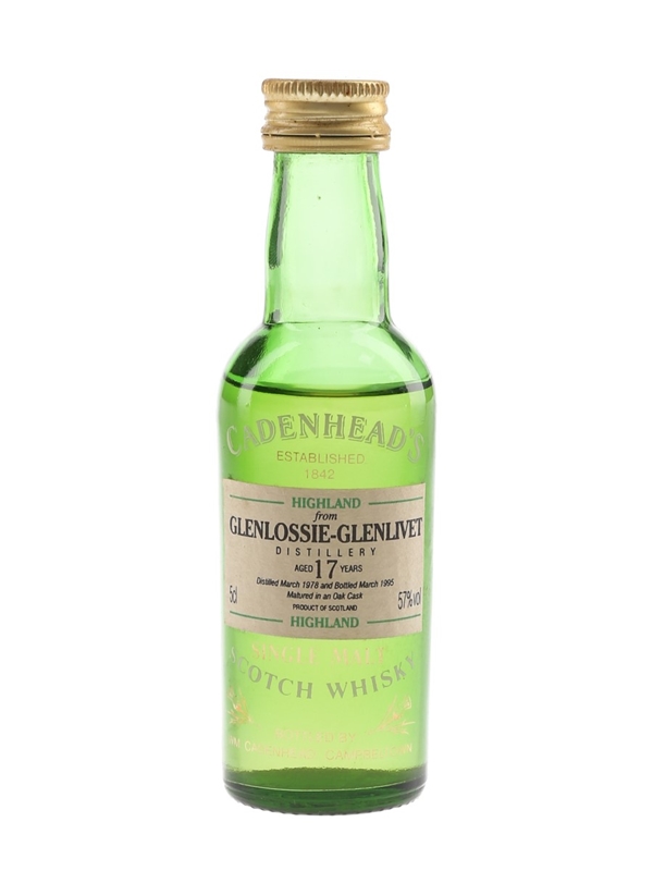 A miniature bottle of Glenlossie-Glenlivet 17 Year Old Single Malt Scotch Whisky. This was distilled in March 1978 and bottled in March 1995 by Cadenhead's.