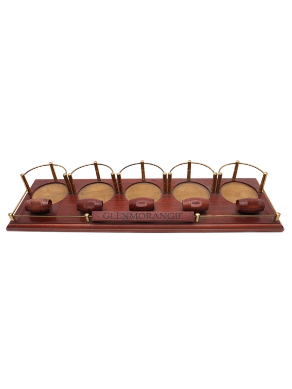 A bottle display from Glenmorangie with space for five bottles. In front of each space is a small barrel representing five of Glenmorangie's expressions: 10 Year Old, Port, Sherry, Madeira and 18 Year Old.