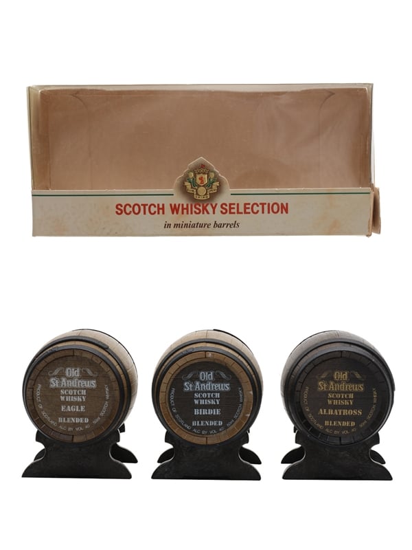 The Old St Andrews Whisky Selection contains three miniatures of Old St Andrews Blended Malt Scotch Whisky presented in barrel shaped bottles: