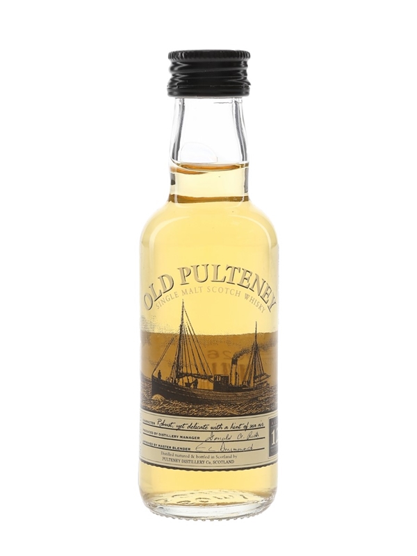 A miniature bottle of Old Pulteney 12 Year Old Single Malt Scotch Whisky, with a screen printed label.