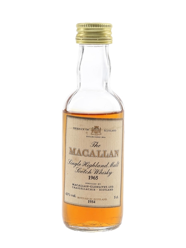 A miniature bottle of The Macallan 1965 Single Highland Malt Scotch Whisky. This was distilled in 1965 and bottled at 43% ABV in 1984.
