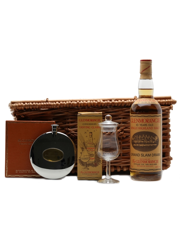 The set includes also a hip flask and tasting glass, all presented in a wicker basket.