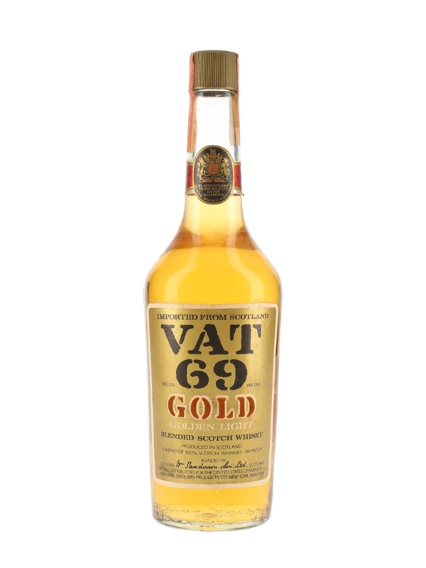 A bottle of Vat 69 Gold Golden Light Blended Scotch Whisky, produced by Wm Sanderson & Son Ltd. This was bottled for the US market and imported by National Distillers Products Co., New York. We estimate this was bottled in the late 1970s.