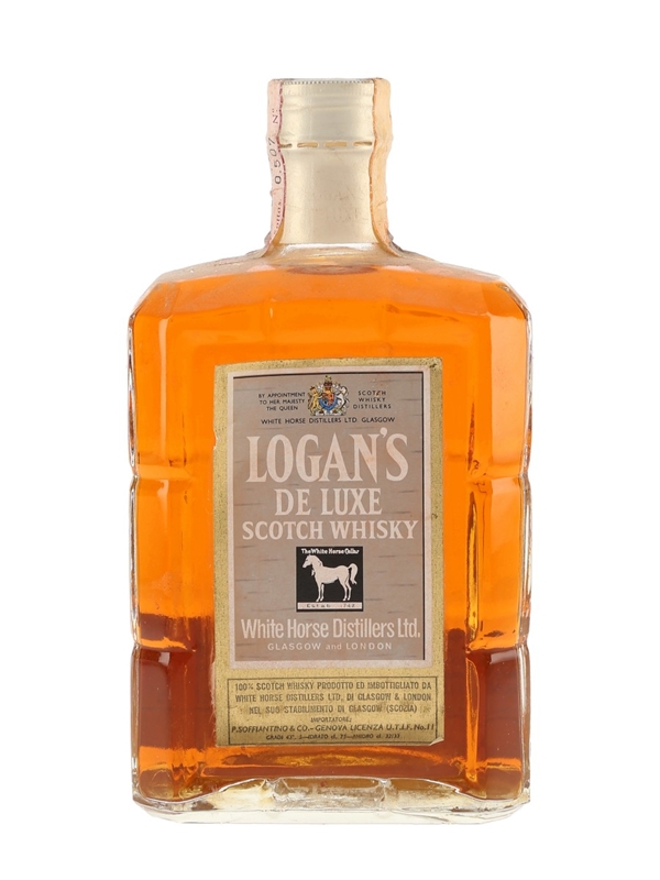 A bottle of Logan's De Luxe blended Scotch whisky produced and bottled by White Horse Distillers. This was imported to Italy by Soffiantino, we estimate in the 1960s.