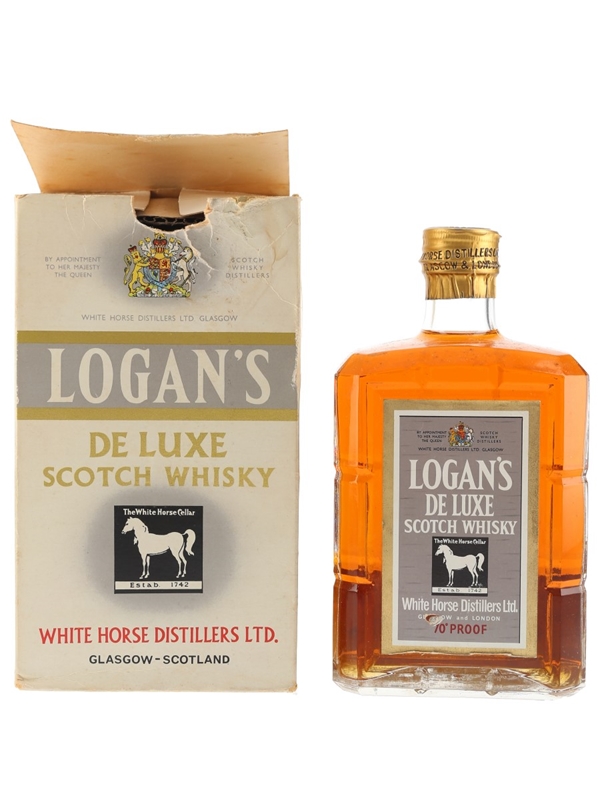 A bottle of Logan's De Luxe blended Scotch whisky produced and bottled by White Horse Distillers, we estimate in the 1960s.