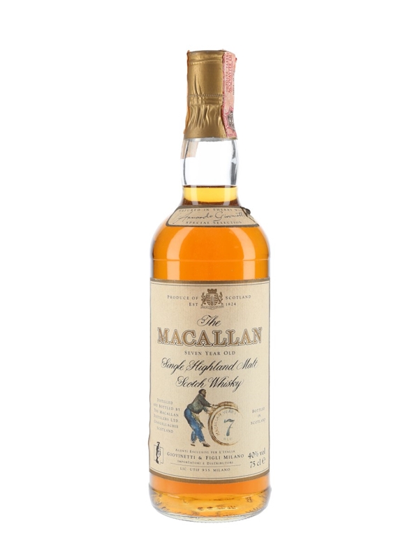 A bottle of The Macallan 7 Year Old Single Highland Malt Scotch Whisky. This was matured in sherry wood and imported to Italy by Giovinetti, we estimate in the 1980s.