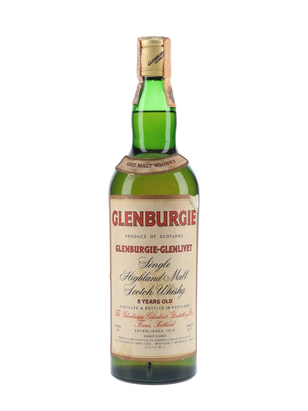 A bottle of Glenburgie-Glenlivet 5 Year Old Single Highland Malt Scotch Whisky. This was bottled for the Italian market and imported by Soffiantino, we estimate in the 1970s.