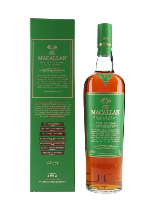 A bottle of The Macallan Edition No.4, a limited edition single malt matured in seven distinct cask types selected by Master Distiller Nick Savage.