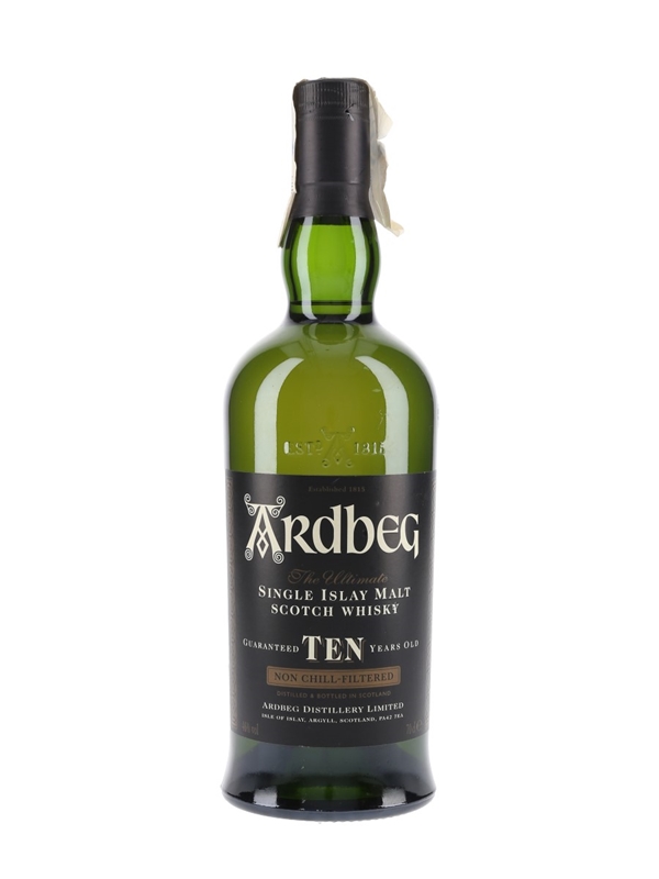 A bottle of Ardbeg 10 Year Old The Ultimate Single Islay Malt Scotch Whisky. The bottling code indicates this was bottled in 2006.