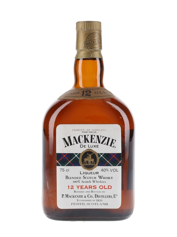 A bottle of The Real Mackenzie 12 Year Old De Luxe Blended Scotch Whisky blended and bottled by P Mackenzie & Co., Distillers Ltd. We estimate this was bottled in the 1970s.