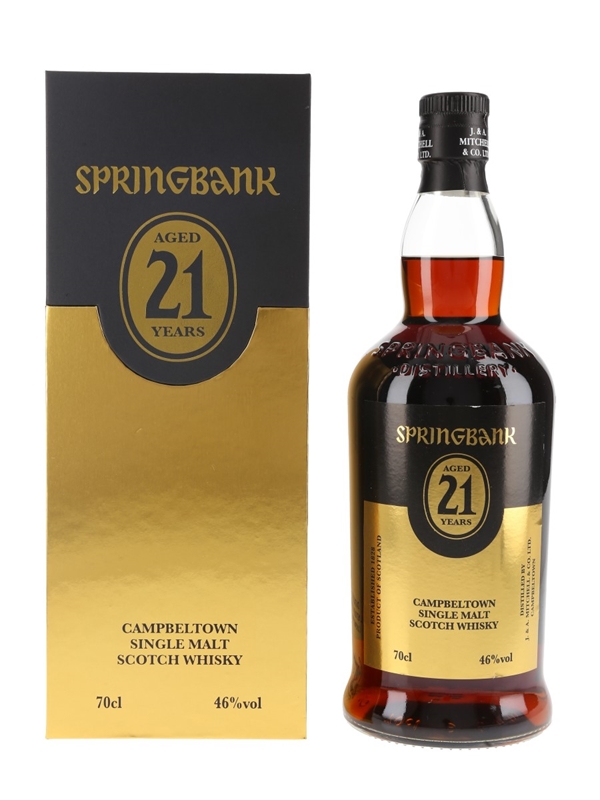 A bottle of Springbank 21 Year Old Campbeltown Single Malt Scotch Whisky. The bottling code indicates this was bottled in 2020.