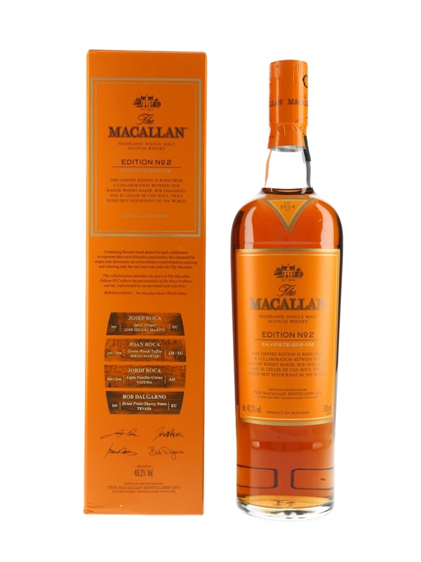 A bottle of The Macallan Edition No.2 Highland Single Malt Scotch Whisky. This is a limited edition matured in four distinct cask types selected by master blender Bob Dalgarno and Spanish chefs Joan, Josep and Jordi Roca from El Celler de Can Roca. The restaurant was twice voted best restaurant in the world.