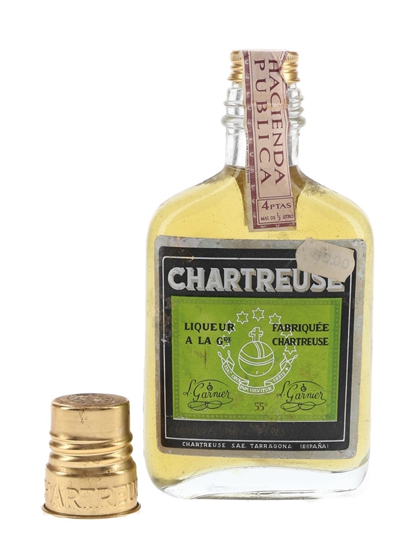 A small bottle of Chartreuse Green liqueur produced in Tarragona, Spain. We estimate this was bottled in the 1960s to 1970s.